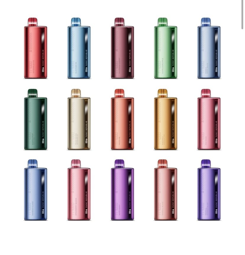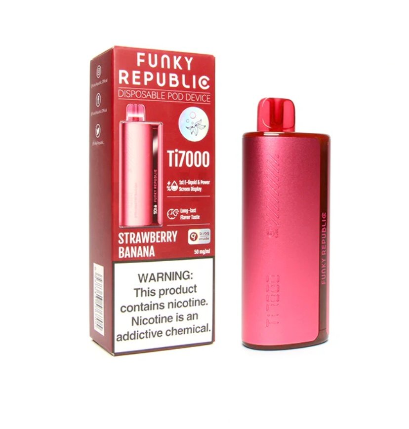 Made by ELFBAR, Funky Republic Ti7000 ( 7000 Puff ) Smart Disposable Device is an innovative disposable that features a liquid and battery life indicator display with long-lasting flavor and 12.8ml of 5%nic that lasts approximately 7000 puffs.