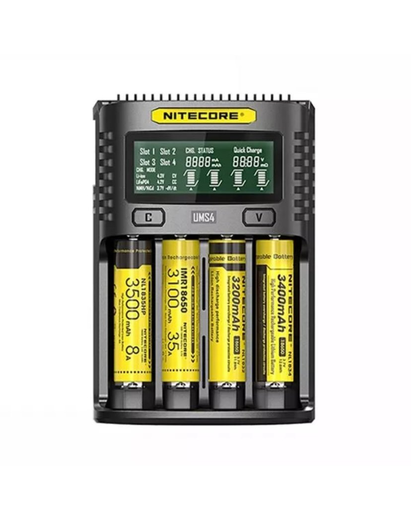 The Nitecore UMS4 stands out as an intelligent USB charger with four slots, supporting QC input for rapid charging. Boasting a maximum output of 4000mA or 3000mA individually, it requires a 9V 2A QC 2.0 adapter for peak performance. When using a QC adapter, the UMS4 can charge a 3500mAh 18650 to 80% in just 55 minutes! This charger excels in maintaining battery longevity, particularly for IMR batteries, with features like over-discharge recovery and battery health monitoring. Its LCD screen provides comprehensive real-time data, and it offers both automatic and manual charging mode selection. With compatibility across various power sources, including power banks and solar panels, convenience is assured. Safety features include anti-short circuiting and reverse polarity protection, with an energy-saving function for idle periods. Compatible with a wide range of battery types, from IMR to NiMH, the UMS4 offers versatile charging options, optimizing performance based on slot configuration.